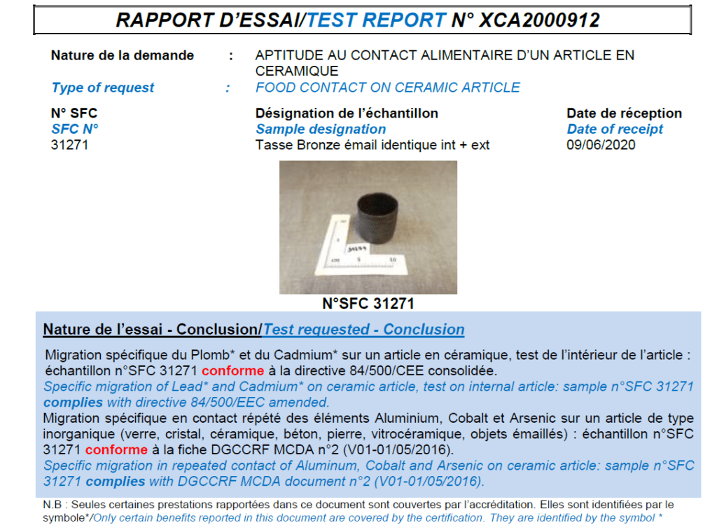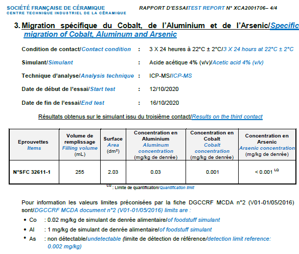 Lorsque j’ai développé la Collection Port-Anna, j’avais fait des recherches avec un émail pour qu’il soit mat, et de cette couleur indéterminée entre le bleu et le vert. Lorsque j’ai terminé la mise au point de mon émail, j’ai fait des tests et j’ai envoyé un échantillon au laboratoire. Manque de chance, le résultat est revenu négatif : l’échantillon n’était pas conforme car la concentration en Arsenic était de 0,026mg/kg de denrée alimentaire alors que ça devait être normalement indétectable (pour information, la limite de détection de référence est de 0,002mg/kg donc là… on en était carrément loin !).