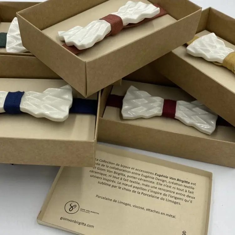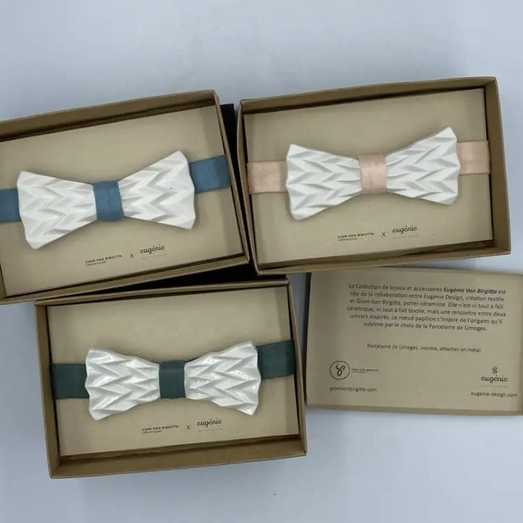 Le nœud papillon s’inspire de l’origami qu’il sublime par le choix de la Porcelaine de Limoges. Un côté est émaillé, l’autre restant brut : ceci permet à la personne qui le porte de choisir l’effet souhaité pour assortir sa tenue (Porcelaine brillante ou Porcelaine mate).